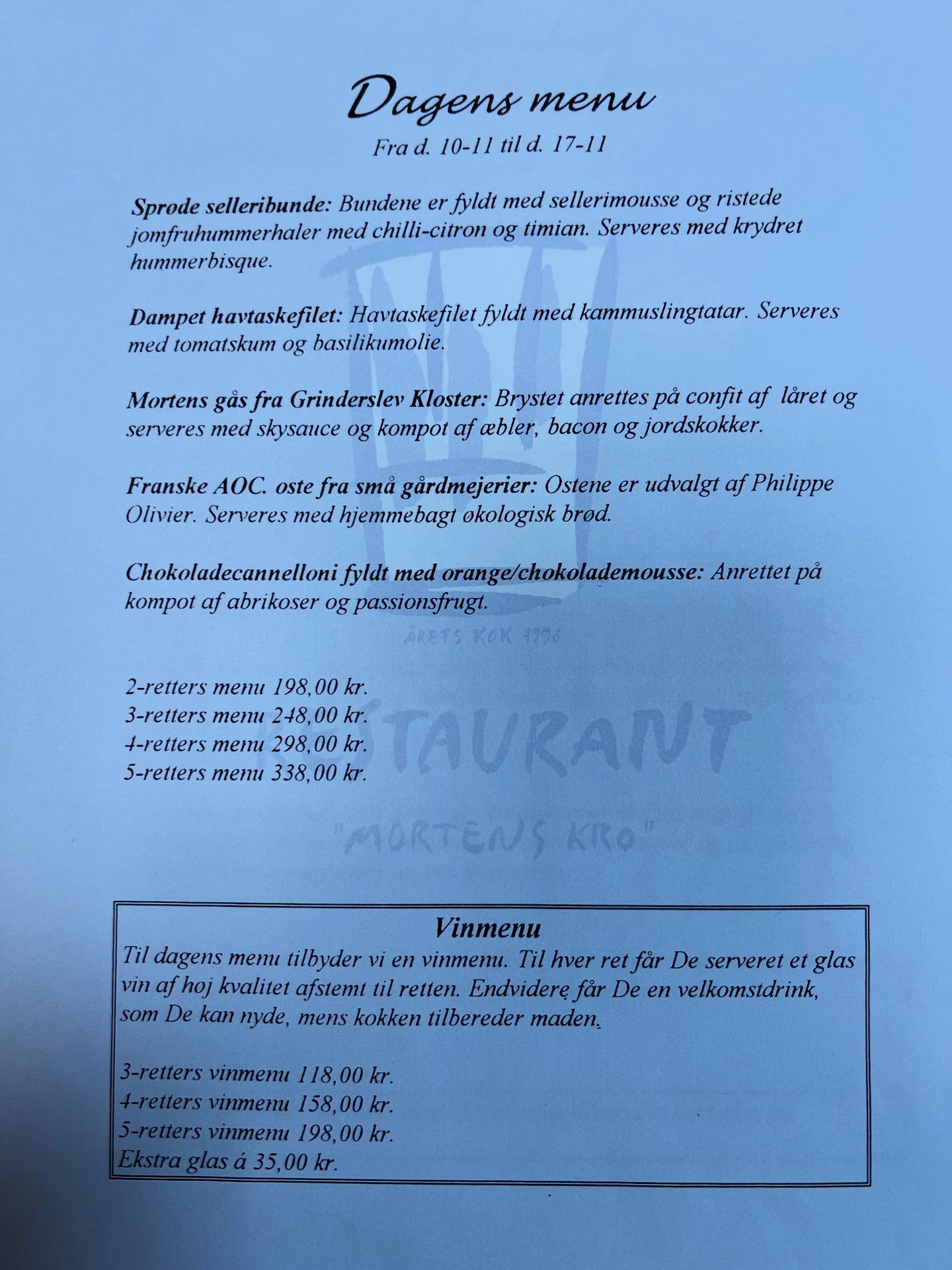 Vi holder åbent denne mandag for at fejre vores 28 års fødselsdag og Mortens aften - med den klassiske menu med appetizers, fiske forret samt den klassiske andesteg med alverdens tilbehør samt konditorens æble dessert. pr kuvert 598,-