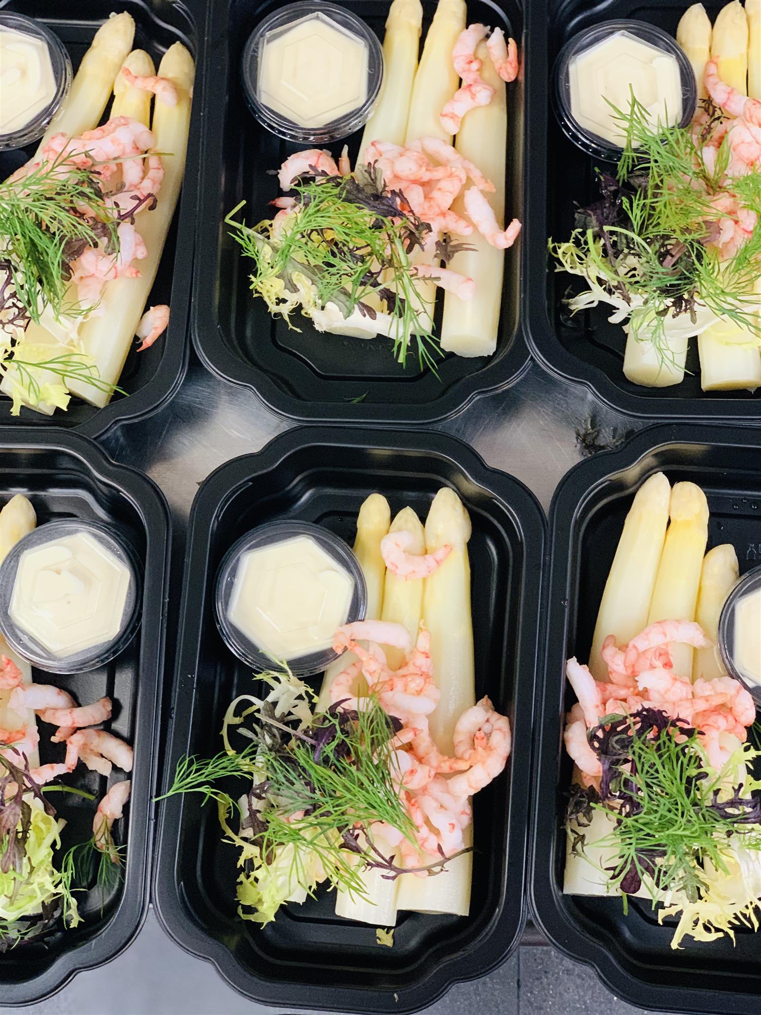 Kold anretning med 3 dampede store hvide asparges fra Loire, håndpillede ishavs rejer, samt kold sauce hollandaise. og krydderurter, citron. Anretning er til en kurvert.