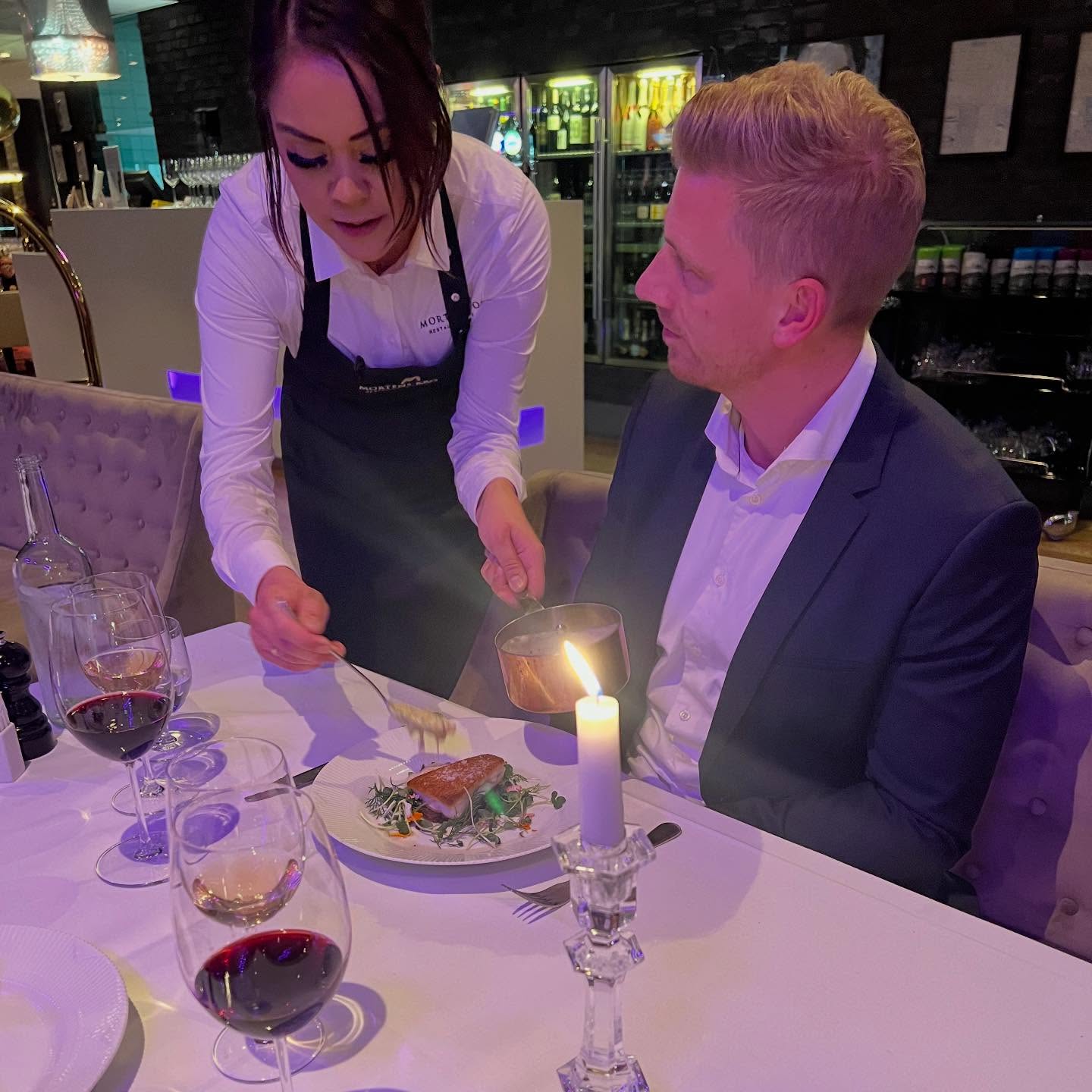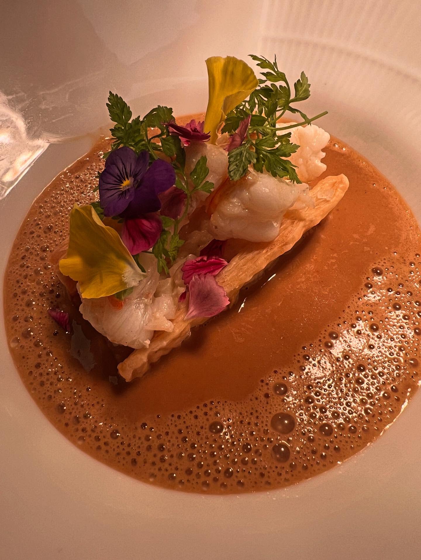 Forret: Pandestegt pighvar filet i tartelet med Læsø jomfruhummer og hummer sauce med tomat og cognac vinter urter og vinter trøffel.